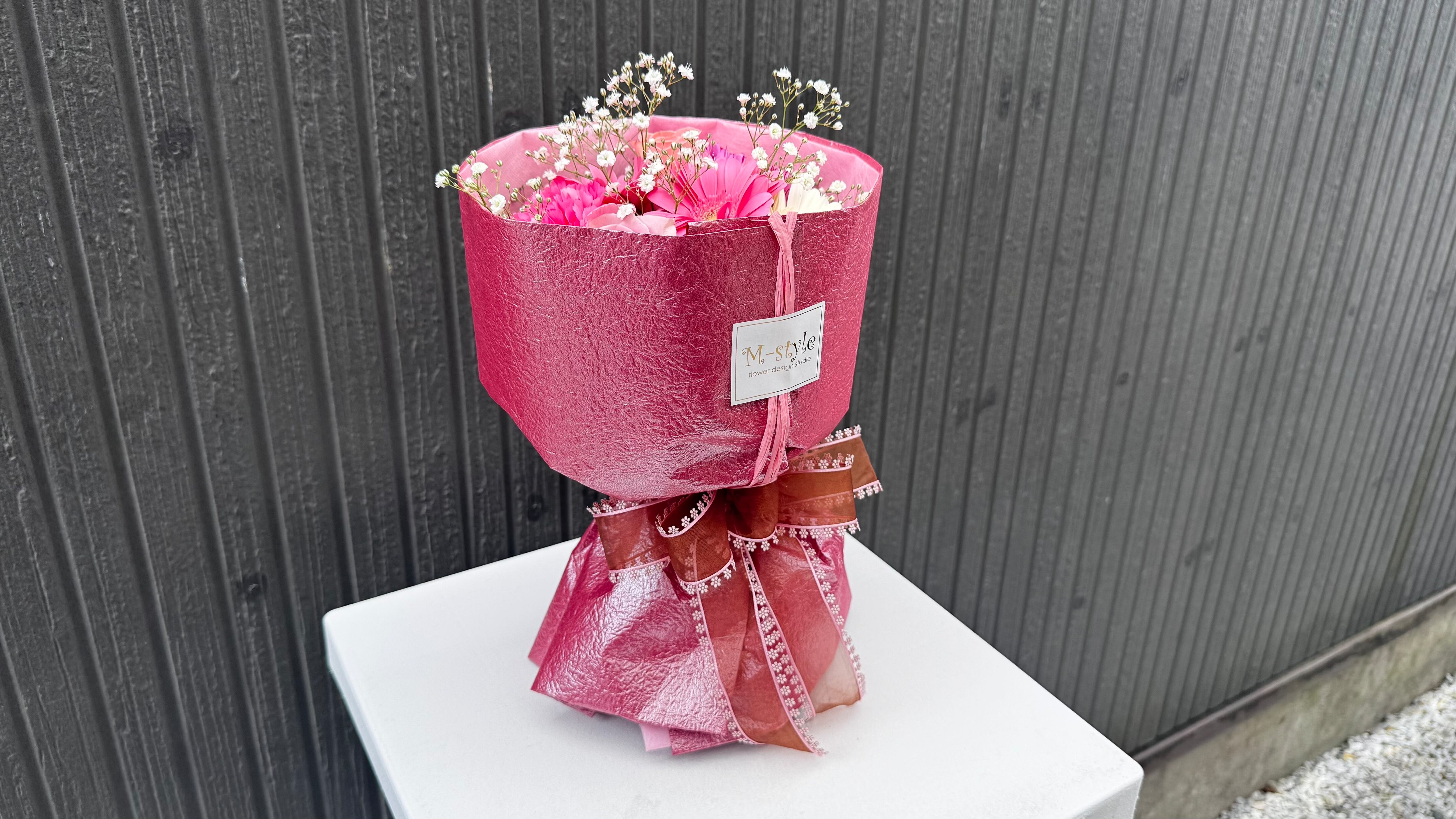 光沢感のある上質なピンクペーパーで包み、シックなリボンで仕上げました。