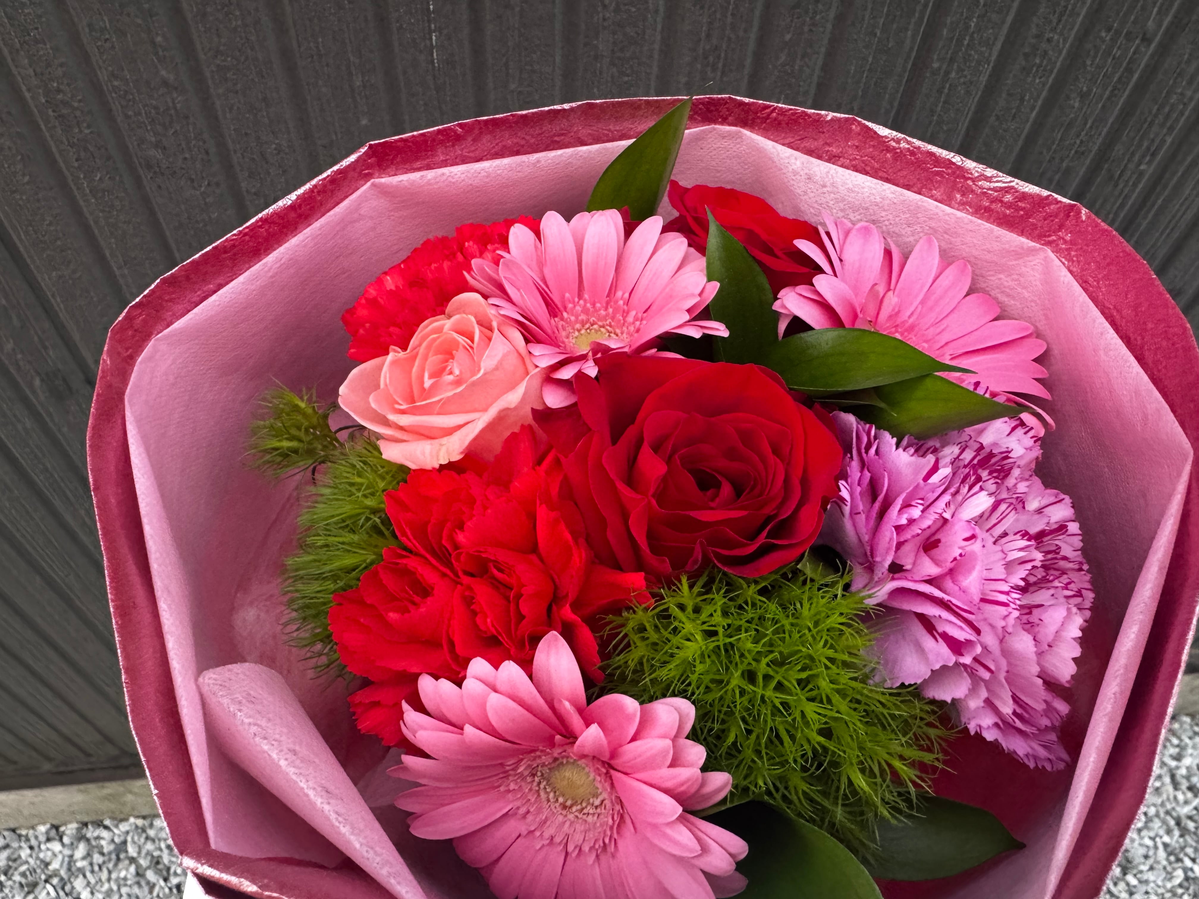 鮮やかなピンクと情熱的な赤が美しく調和した、華やかで可愛らしいブーケスタイルの花束です。