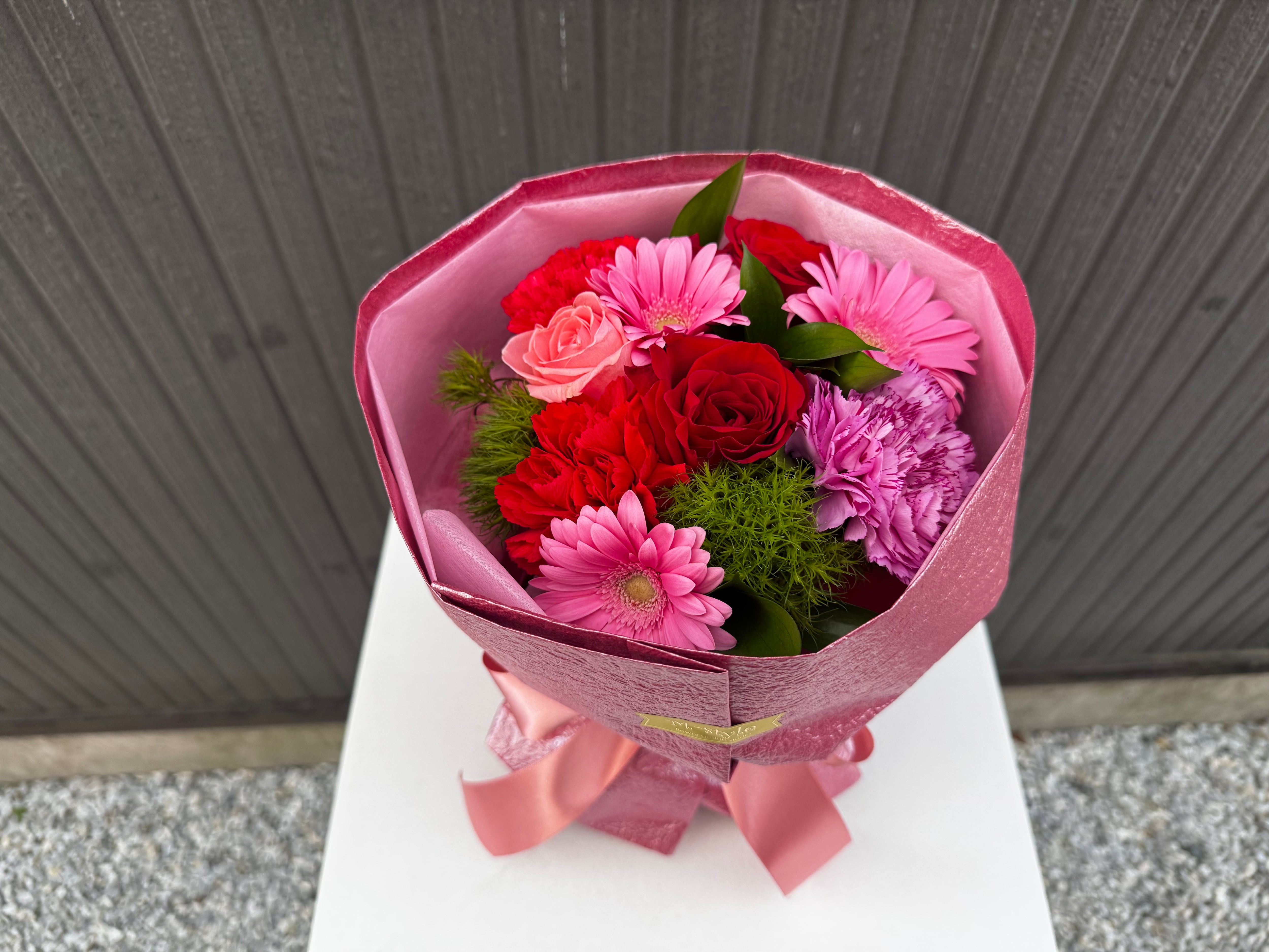 ピンクのガーベラやカーネーションに、真紅のバラとカーネーションがアクセントとなり、ふわふわのグリーンと葉物がナチュラル感をプラス。見た目にもインパクトのあるギフトに仕上がっています。