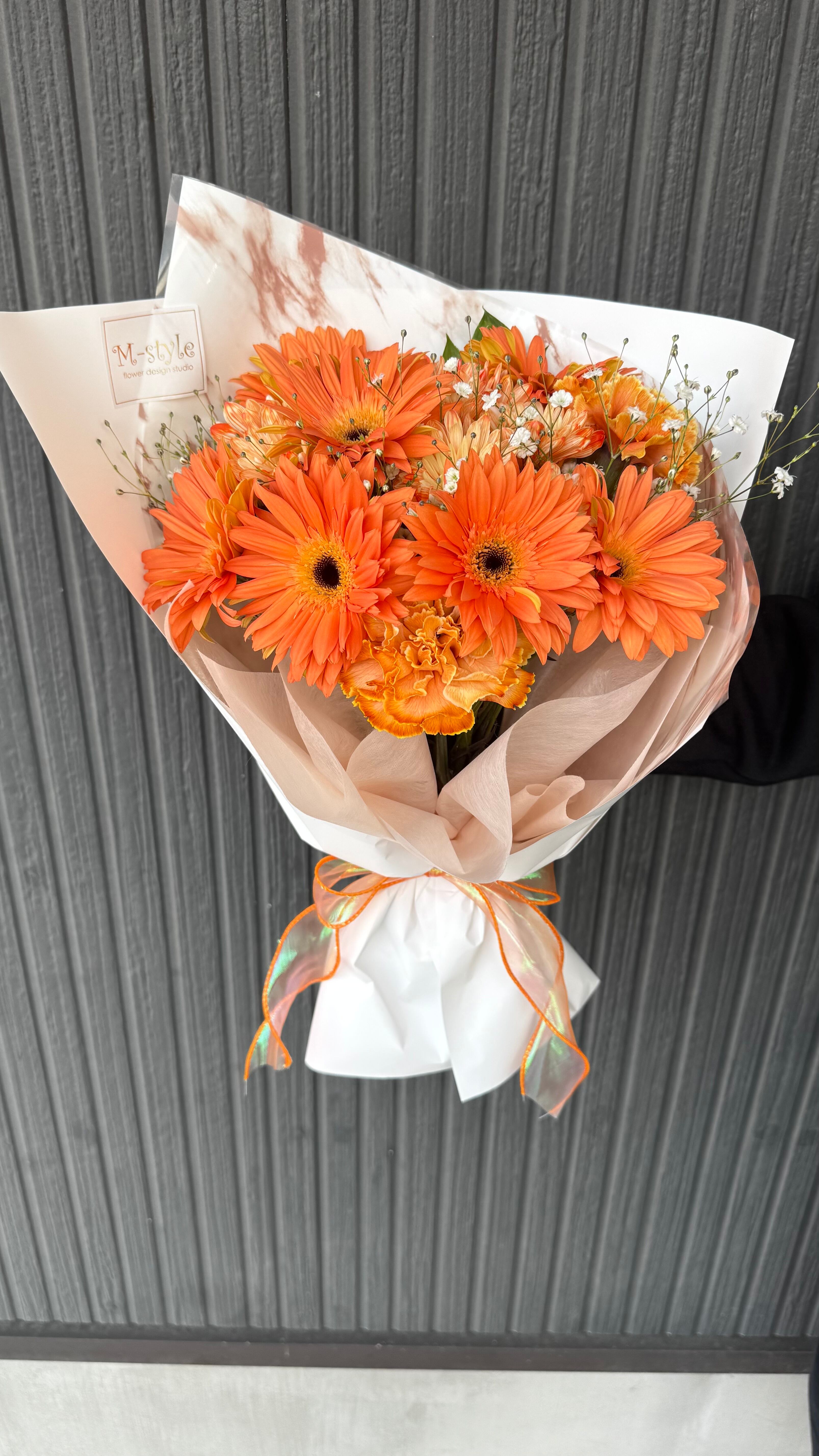エルメスオレンジのカーネーションとガーベラ、さらに存在感抜群のオレンジの大輪ガーベラが贅沢に使われ、華やかさと元気をたっぷり詰め込んだデザイン。かすみ草の優しい白が全体を柔らかく包み込み、バランスのとれた美しい仕上がりになっています。