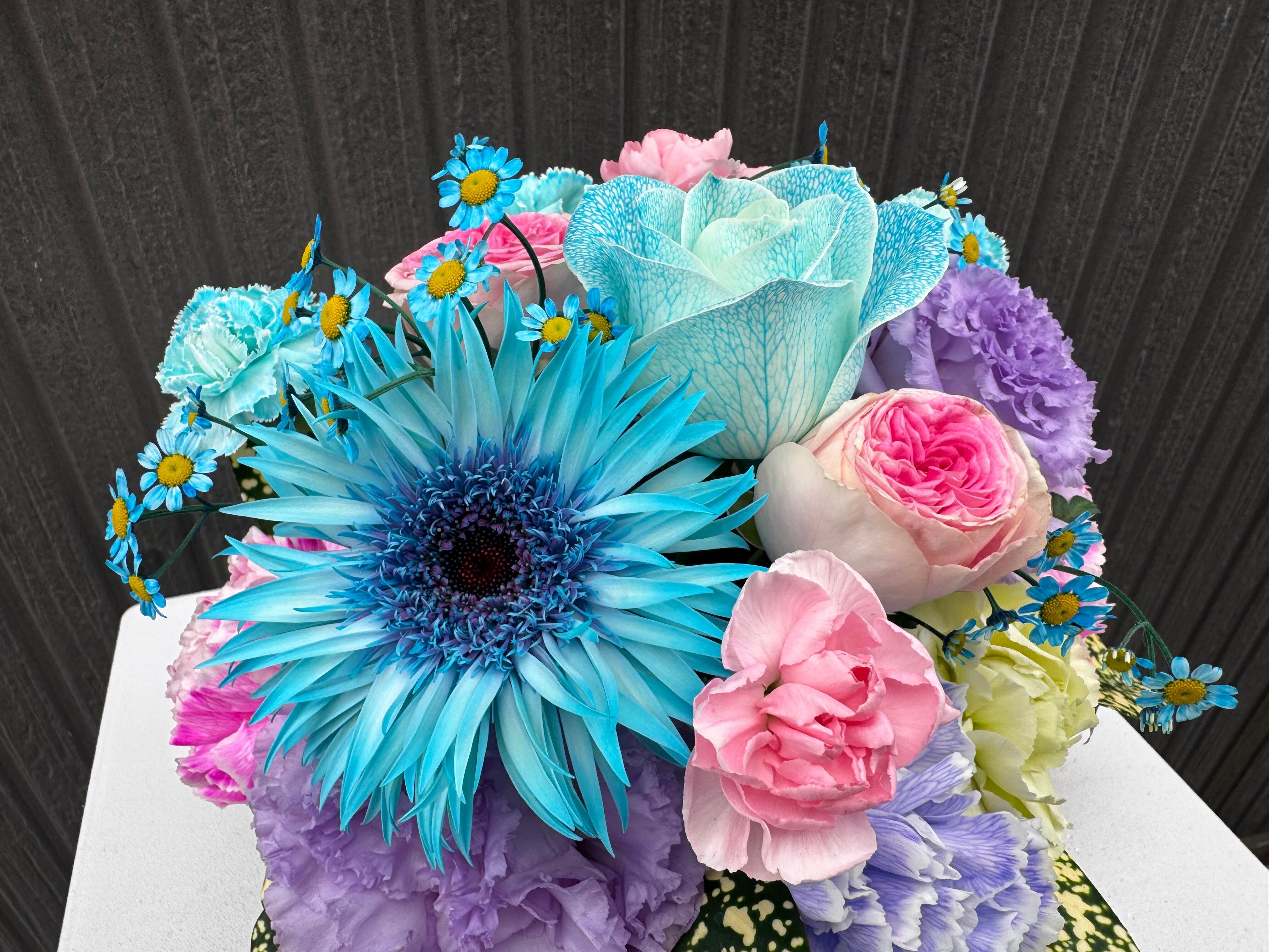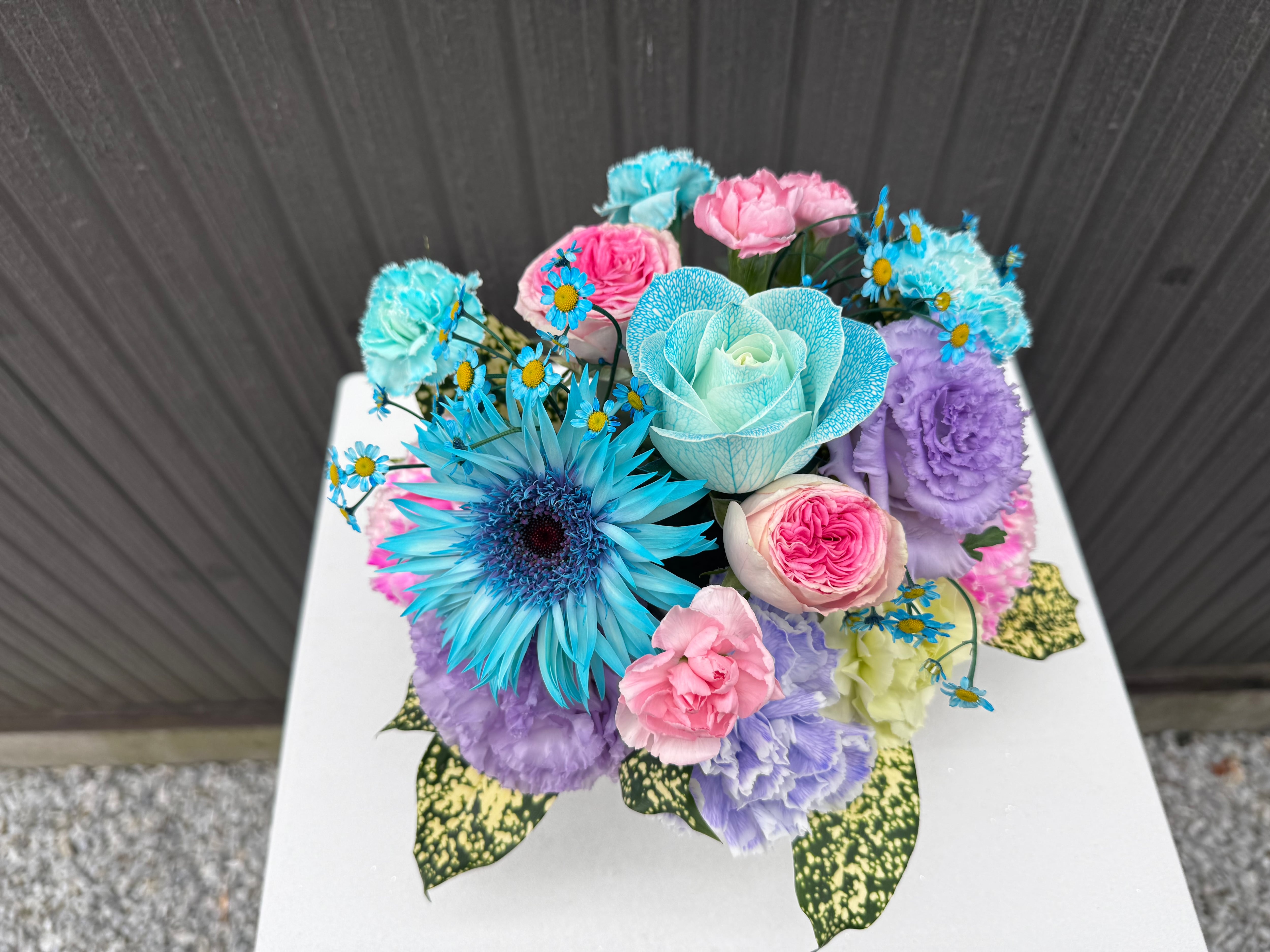 幻想的なオーシャンブルーの花々を主役に、やさしく寄り添うように薄紫、薄ピンク、そして爽やかな黄緑の花々を合わせた、洗練された色合いのアレンジメントです。