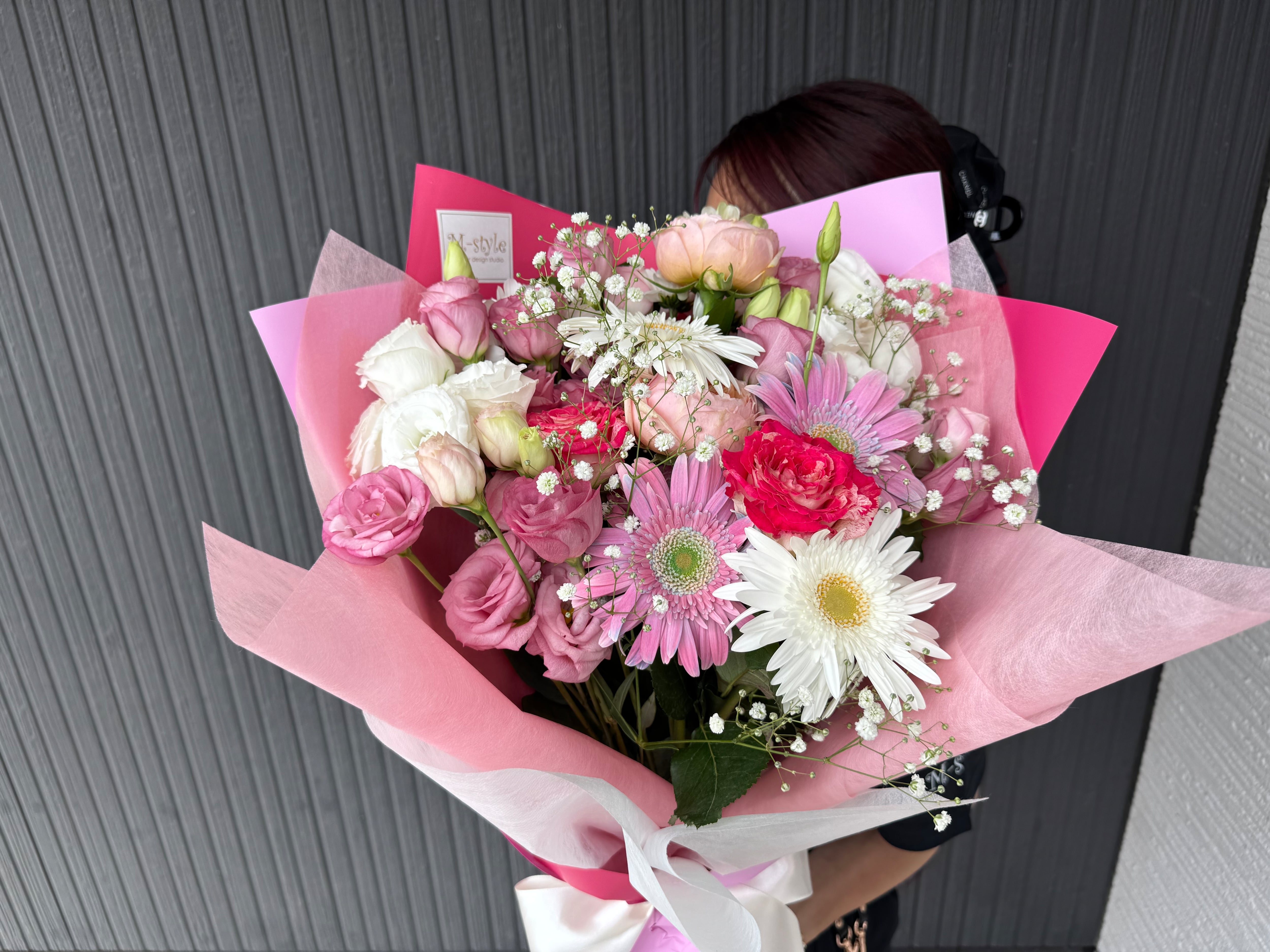 淡いピンクと清楚なホワイトを組み合わせた、上品でやさしい印象の花束です。ふんわりとした可憐な雰囲気にまとめました。