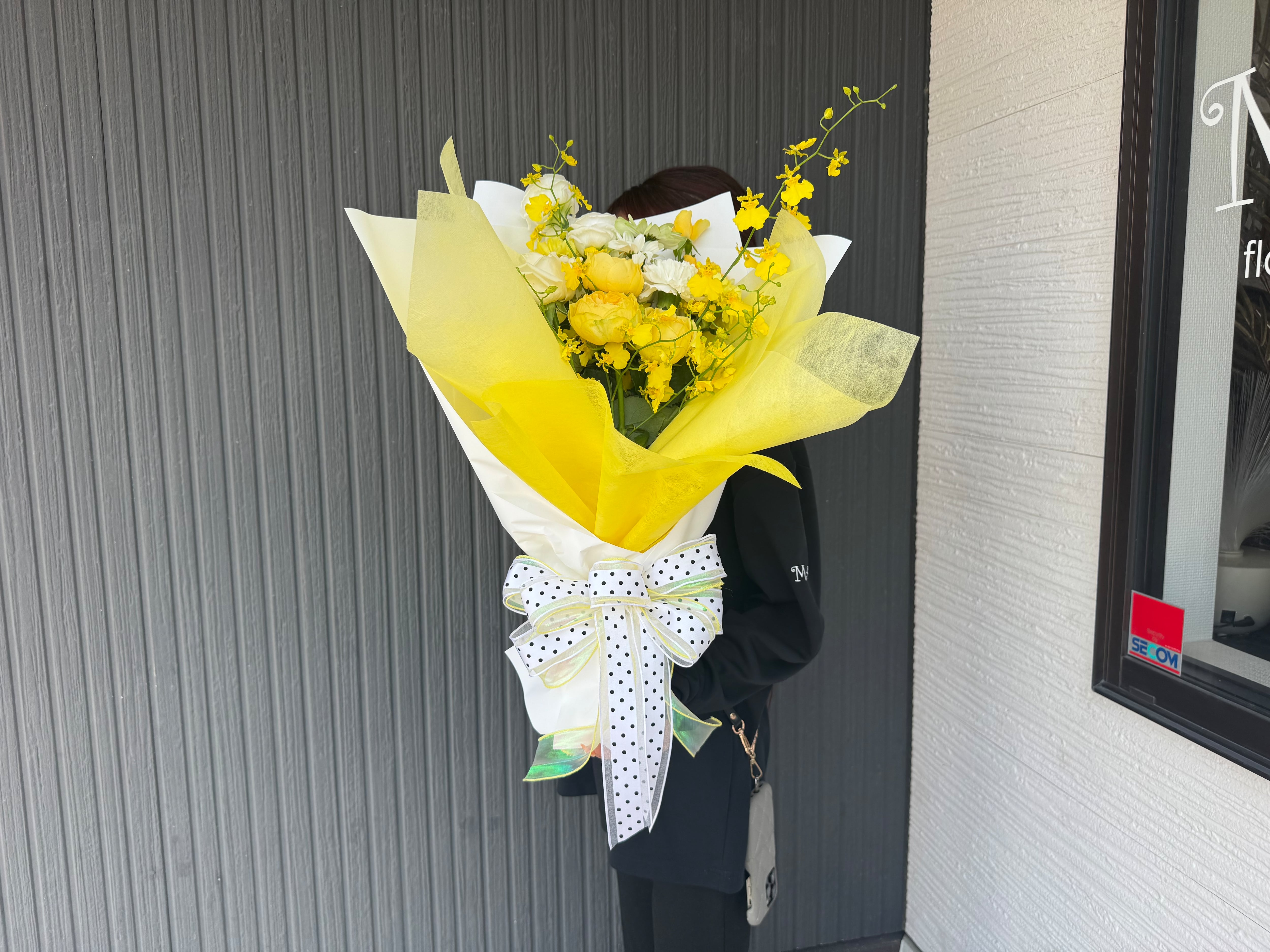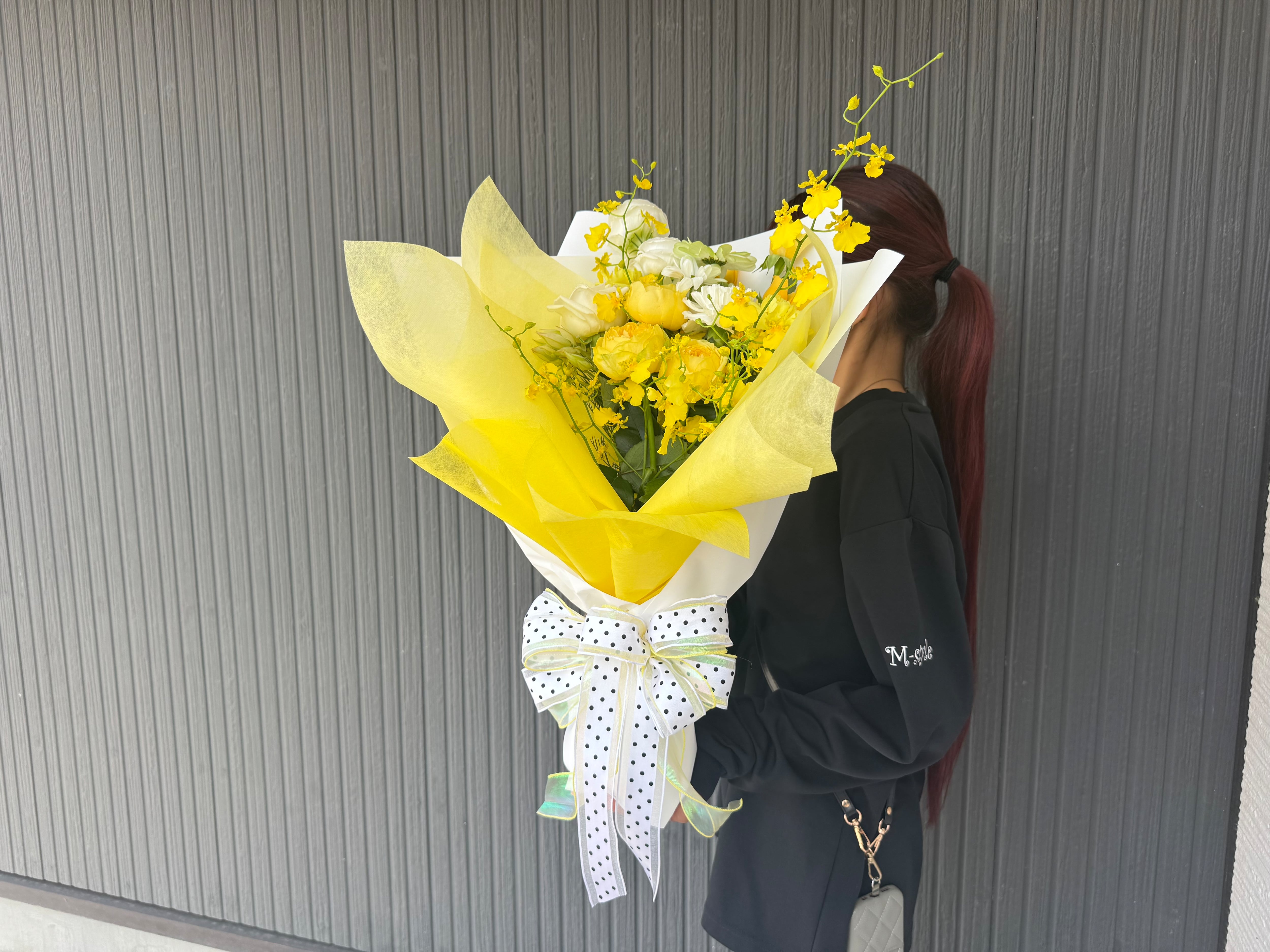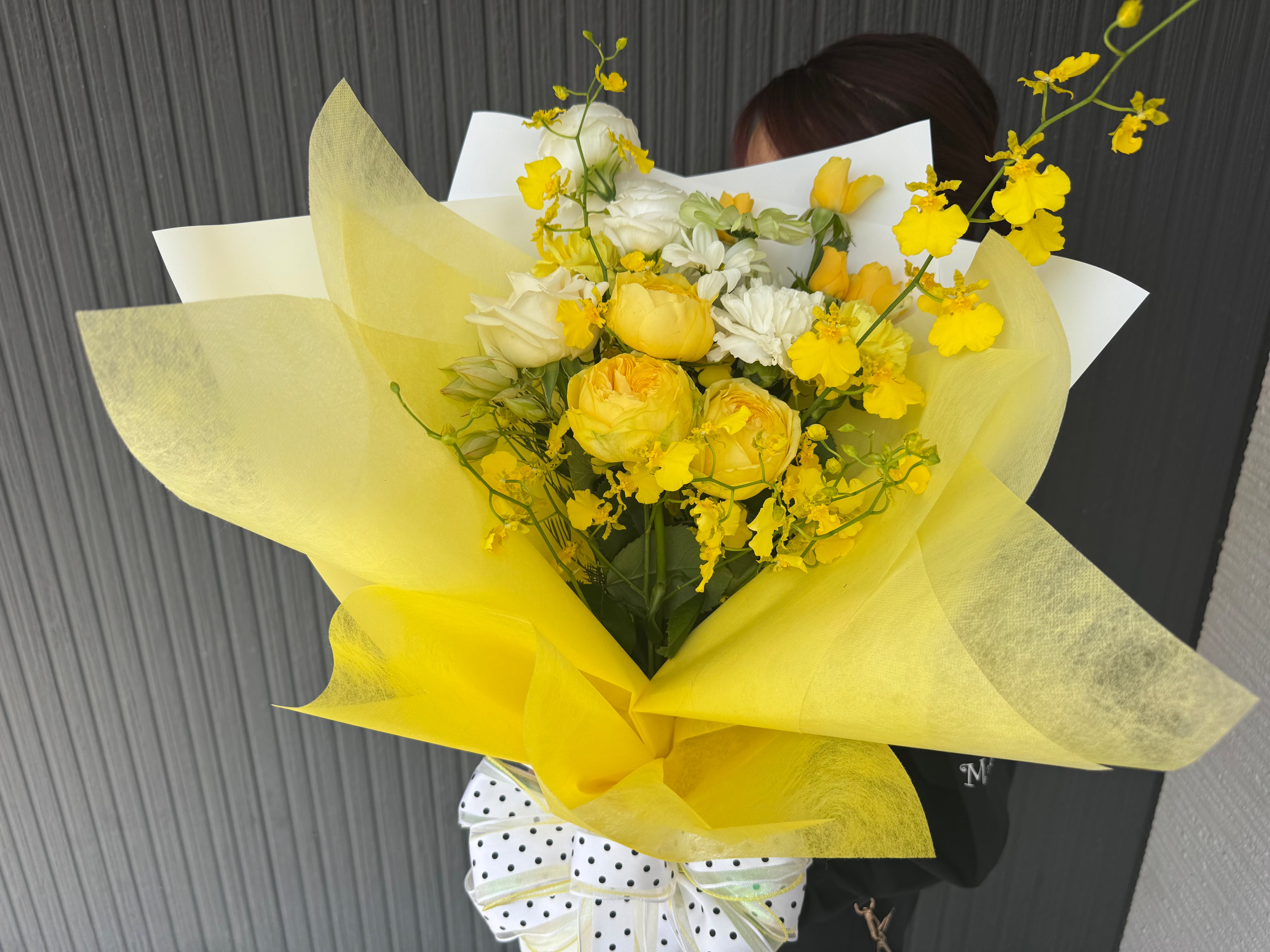 明るい黄色をメインに、ほんのり白を加えてやさしくまとめた、ナチュラルで元気な印象の花束です。華やかさと軽やかさを兼ね備えた花々を贅沢に束ねました。