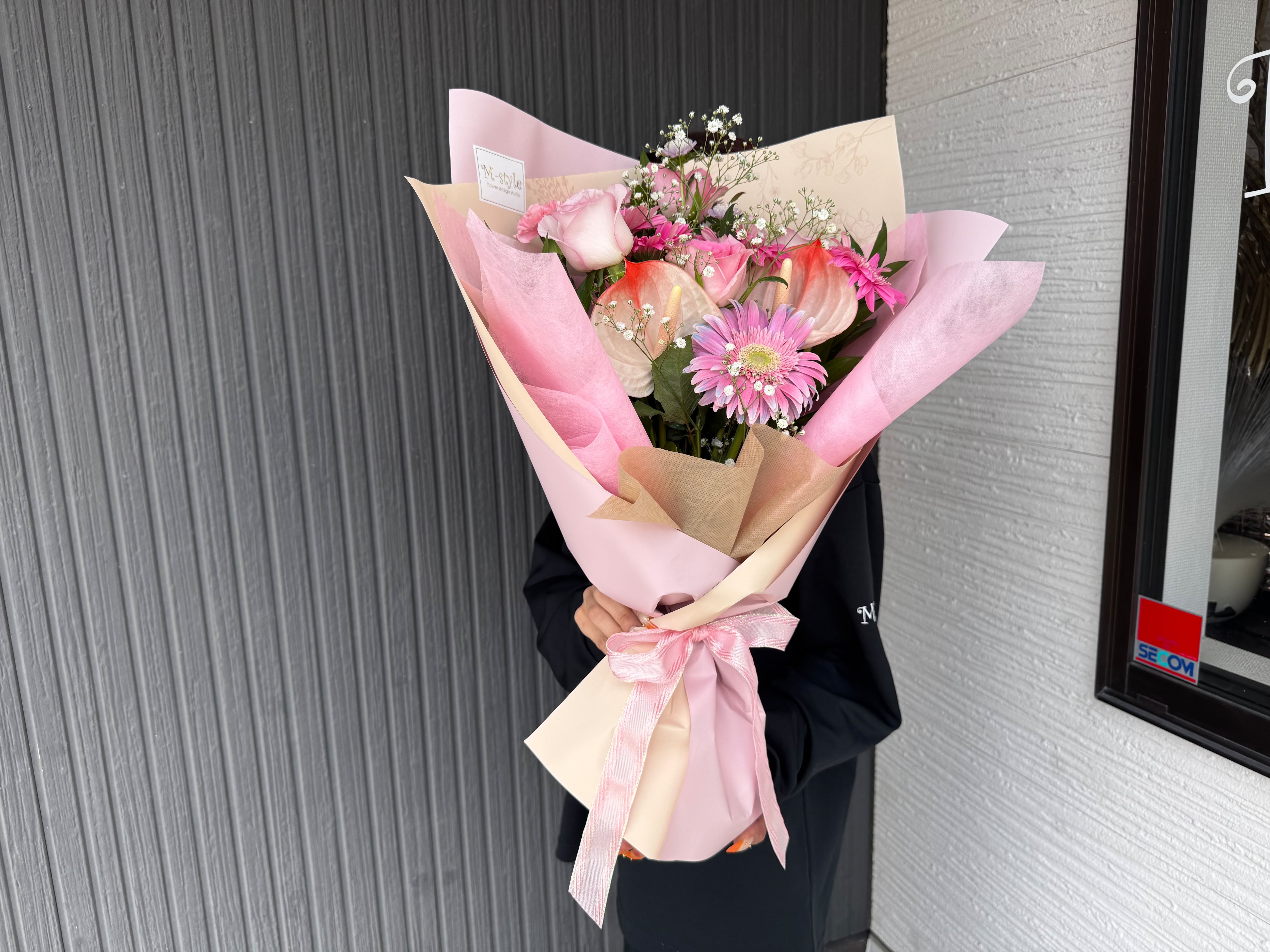 バラやガーベラ、アンスリュームをふんわりと束ねた、女性らしい柔らかな印象の一束です。