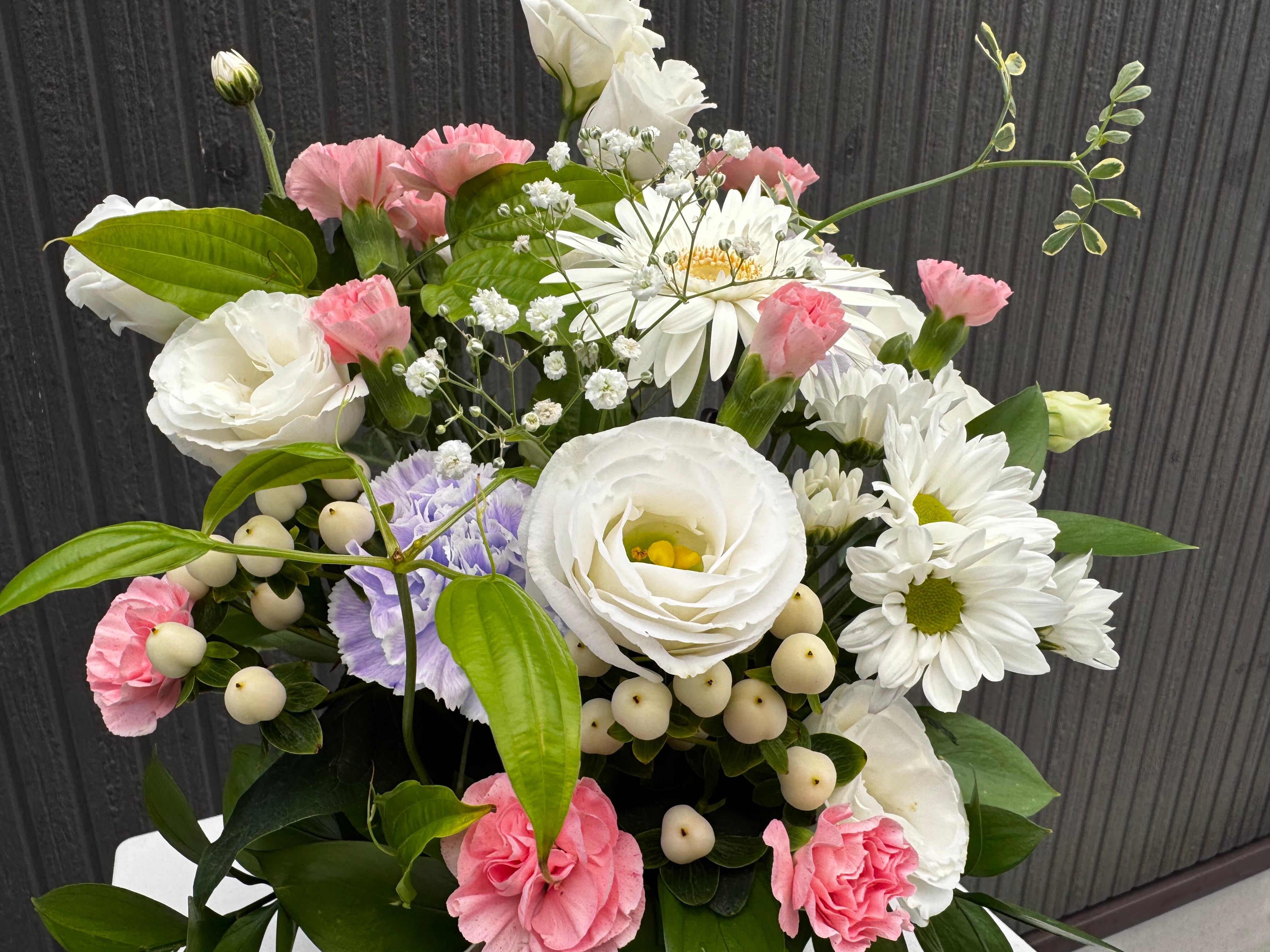 カーネーション、トルコキキョウ、ガーベラ、ヒペリカム、スプレーマム、かすみそうなど、多彩な花材を繊細に組み合わせました。