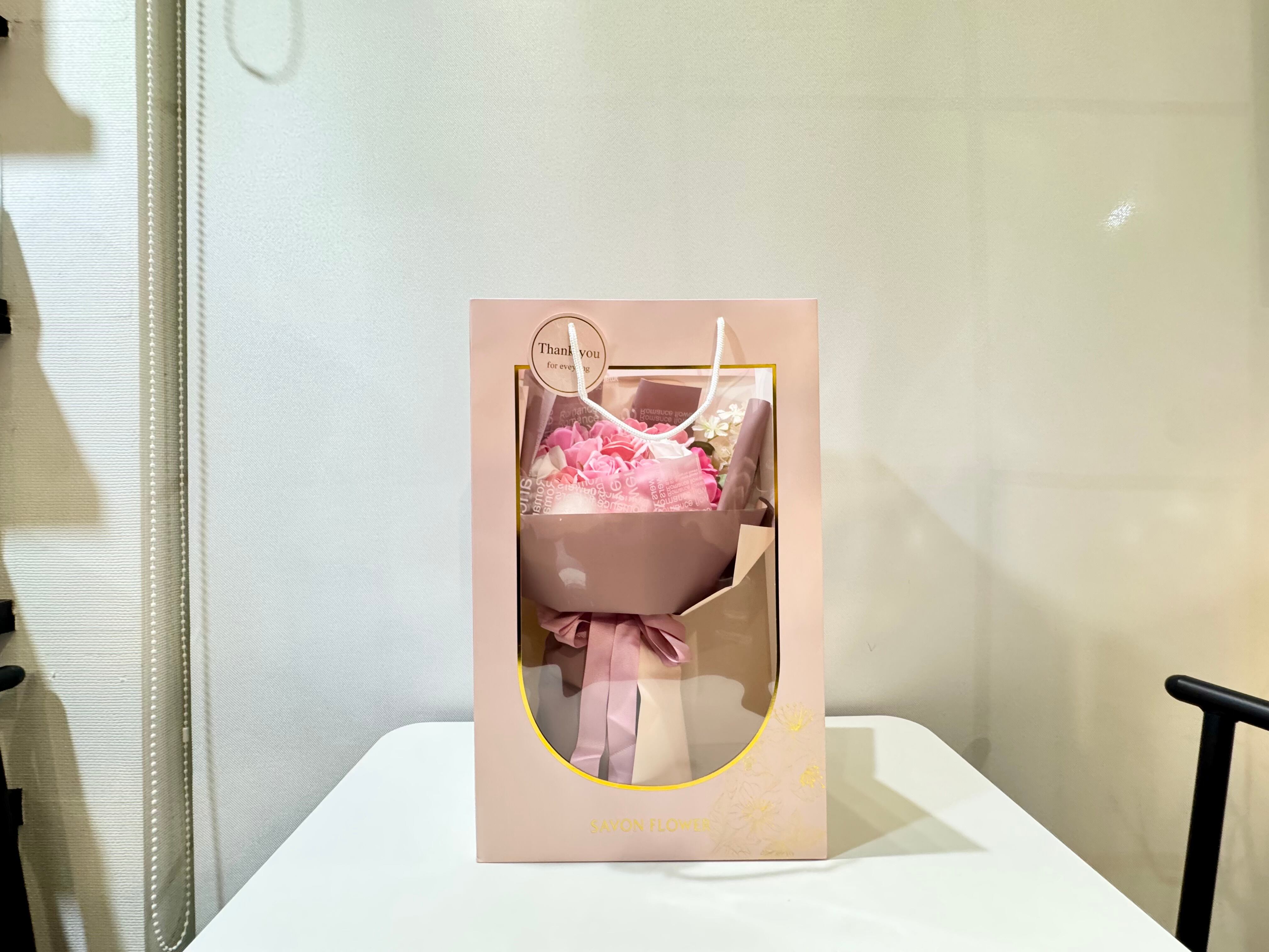 優しいピンクのバラをソープフラワーでまとめた、可憐で愛らしい花束です。